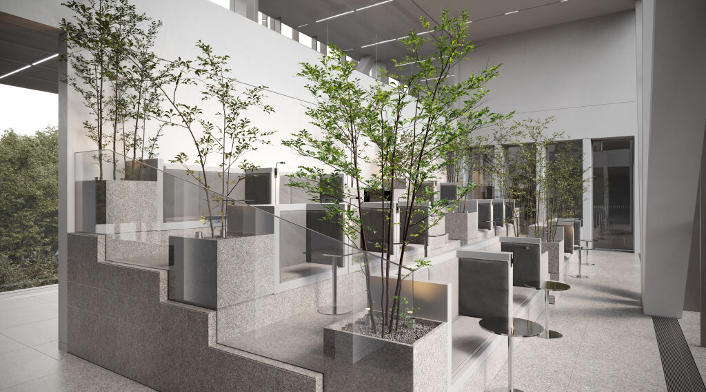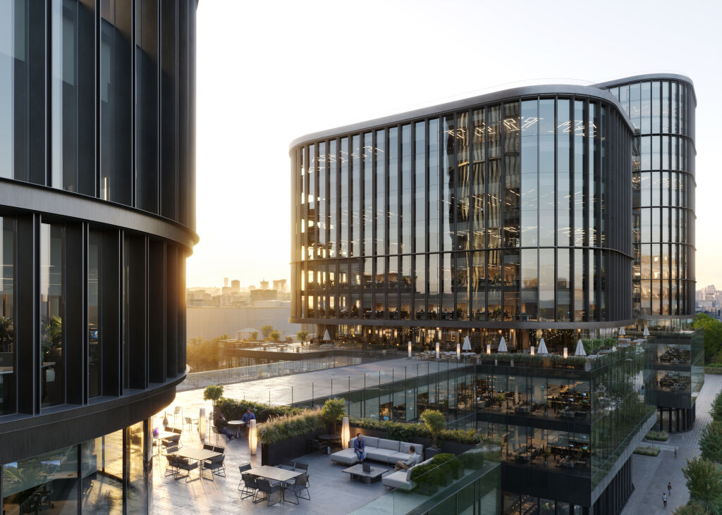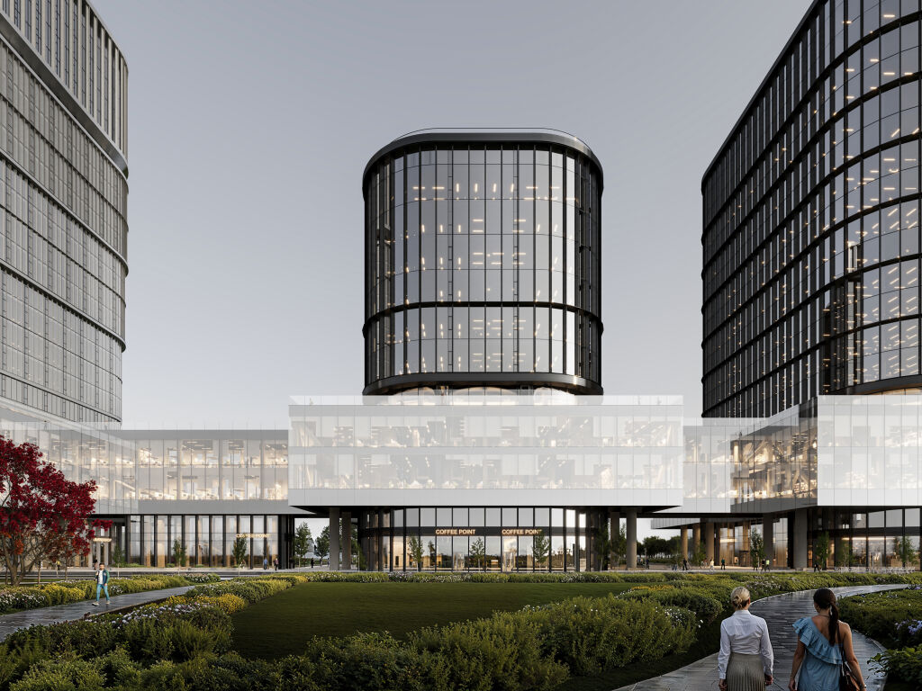 Архитектурную концепцию проекта разработало бюро Kleinewelt Аrchitekten. Чистая и стройная структура здания будет гармонично вписана в зеленый ландшафт прилегающего парка. Фасады из стекла и металла украсят динамичные ламели, а полукруглая форма башен отсылает к форме парка «Ходынское поле». Дизайн-концепция лобби от KEMELIN PARTNERS в натуральных материалах с двусветным пространством, зонами ожидания, стойками ресепшен и лифтовыми холлами объединила комфортную логистику с мультформатной средой: это комфортные бизнес-гостиные с кофе-поинтами, лаунж-зоны для неформального общения и отдыха, переговорные комнаты, а также пространство с амфитеатром, где можно будет устроить кофе-паузу и насладиться умиротворяющим видом на парк Ходынское поле.