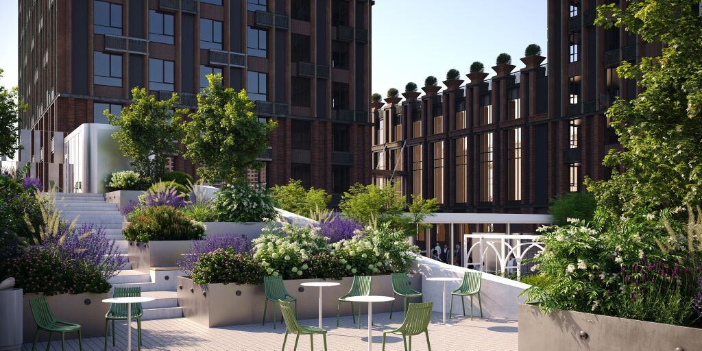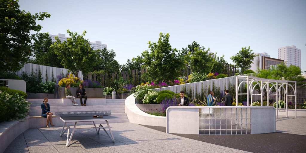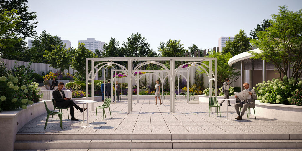 В рамках бизнес-центра появится парк-коворкинг «Поток». Это уникальная среда, где нет жёстких границ между офисом и парком, зеленый оазис с возможностью сочетания работы и отдыха. Здесь резиденты бизнес-центра сами определяют ритм своего дня: бизнес-встречи в smart-переговорных под открытым небом, совещания и мозговые штурмы на ступенях амфитеатра, отдых в тени деревьев и на парящих качелях.