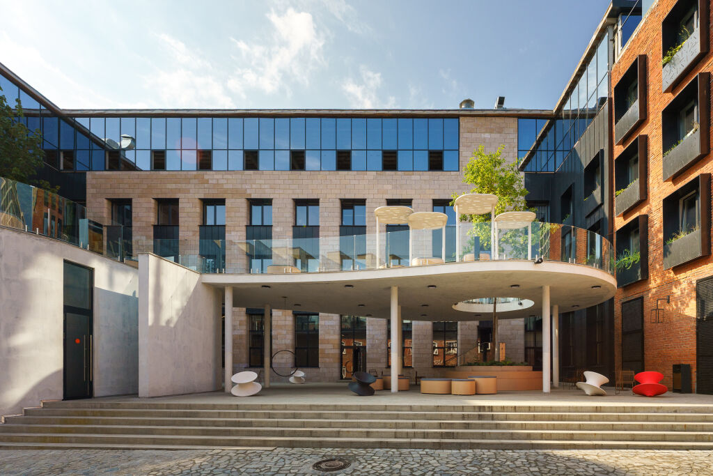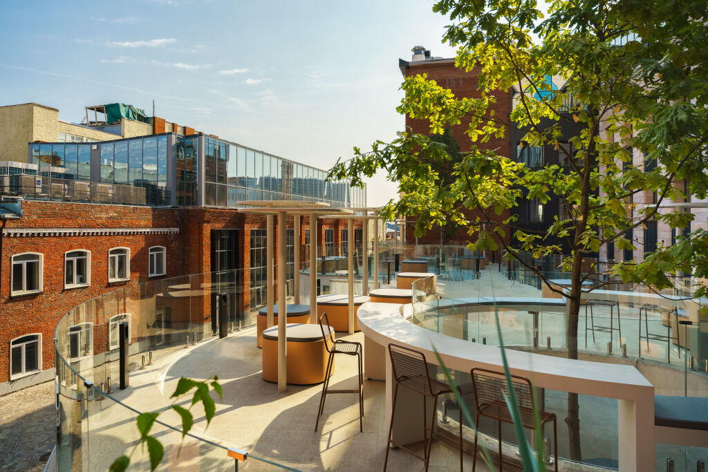 В отделке фасада использован исторический кирпич, кортеновская сталь, медные и деревянные панели. На территории создано современное городское пространство, организована комфортная рабочая среда. Для резидентов есть лаундж-зоны, спортивные и интерактивные площадки. В центре квартала располагается веранда с качелями, предназначенная для отдыха резидентов, со второго этажа которой открывается вид на квартал.